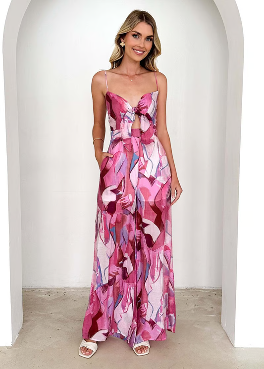 Annalise - Chic Printed Suspender Strap Long Dress