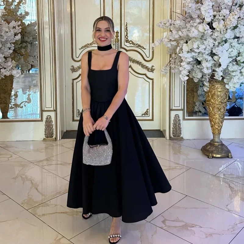- Design: Features a structured bodice with wide straps and a timeless square neckline