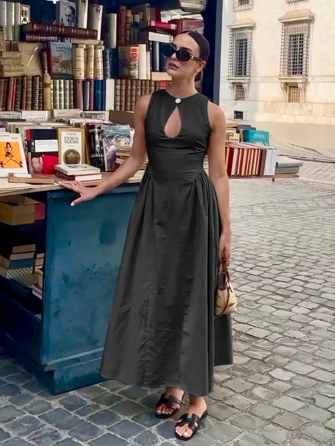Design: This dress features a sleeveless design with a pleated skirt and subtle cutout details at the waist, creating an elegant and airy silhouette.
